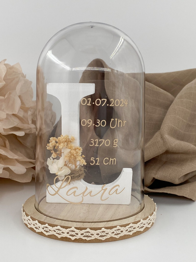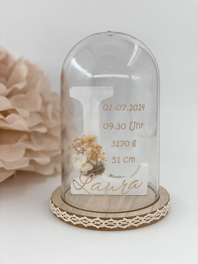 Die Geburt eines Babys ist ein unvergesslicher Augenblick – voller Liebe, Staunen und Freude. Mit unserer handgefertigten Kuppel hältst du diesen besonderen Moment für immer fest. Jede Kuppel wird individuell gestaltet und mit den wichtigsten Geburtsdaten wie Name, Datum, Uhrzeit, Gewicht und Größe liebevoll personalisiert.